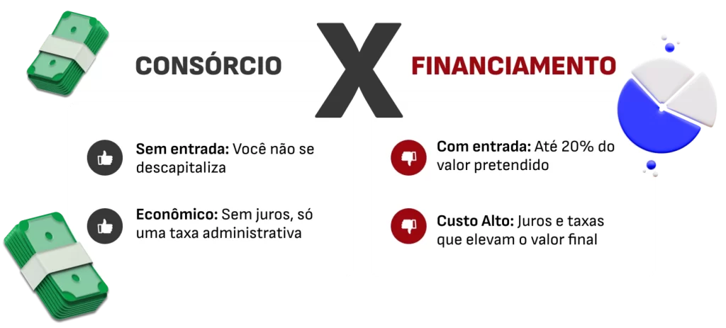 Qual é a diferença entre consórcio e financiamento? Resposta: No consórcio, você não paga juros, apenas uma taxa de administração, enquanto no financiamento, você paga juros altos.